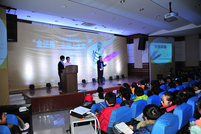 第二环节——“智慧问答”,在决赛前的准备阶段,我们邀请了学生比较熟悉的老师来提问问题并录制成视频资料,在这个环节选手随机抽取,并在规定时间内回答,这个环节主要考验主持人的思维速度和深度,以及语言表现能力,颇具挑战性,这一环节有3名同学不幸被淘汰。