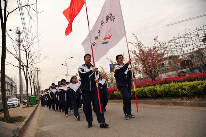 下午4点30分,高一年级全体学生身着校服,胸前佩戴共青团团徽,高举团旗和校旗,在政教处主任曹耀忠老师、管维新老师、孙钢老师和高一年级主任从晓老师以及各班班主任的带领下,排着整齐的队伍步行来到通州区烈士陵园。