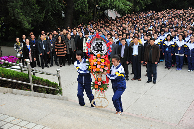 高一5班瞿子钰同学宣读了祭文。她从1840年的鸦片战争谈起,到当今中国存在的雾霾问题,昆明事件等,抚今追昔,呼吁学子们要以学习上的奋进报效祖国。