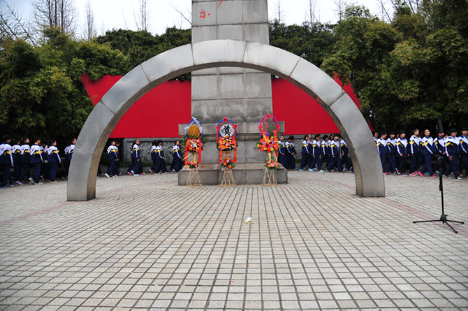 陵园内巍峨的烈士纪念碑庄严而又肃穆,苍松翠柏绿意盎然。我校千名高一学子在纪念碑前肃立默哀,神情庄重。