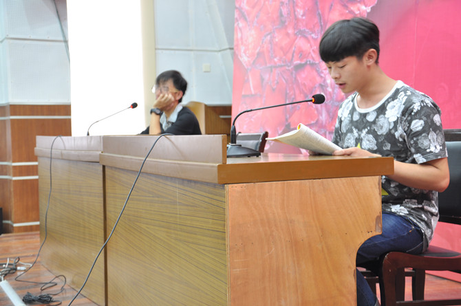 播音员面试分两次进行。一面时请各位同学选择一段适合自己的文本进行朗读,再根据台下各位评委的打分,挑选出进入二面的选手。各位同学在认真的挑选完内容后都紧张的练习着,希望可以把自己最好的状态展示出来。台下的评委也都认真的倾听着每一位同学的朗读,整个会场都弥漫着紧张的气氛。经过一场激烈的角逐,最终挑选出了20名优秀的同学进入第二轮面试。