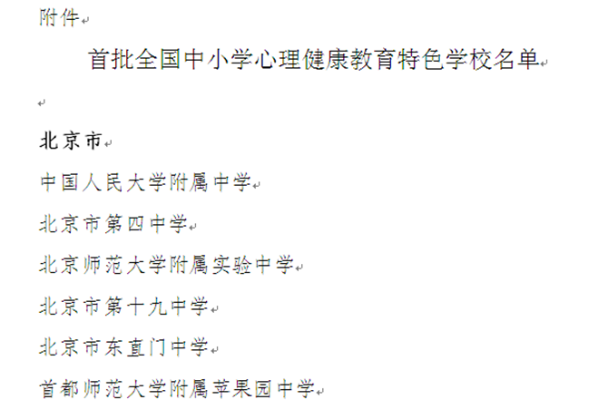 我校被评为教育部首批中小学心理健康教育特色学校 时间:2015-10-22 作者:阳光 浏览:次 分享到: 2015年9月10日,教育部办公厅发文(发文字号:教基一厅函[2015]44号)公布首批205所全国中小学心理健康教育特色学校名单。这205所学校是在省级教育部门审核推荐,有关专家综合评审的基础上,由教育部认定并命名的。江苏省共有8所学校入选,我校榜上有名。(阳光) 打印正文 关闭本页 扫一扫关注通州高级中学