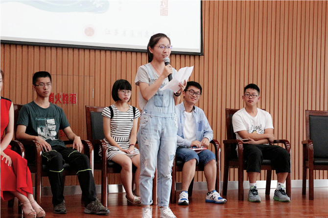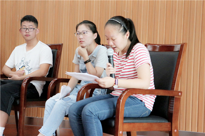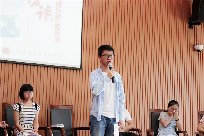 随后,现场的6位我校2016届优秀毕业生和2名高三学生代表就自己的高中经验和高一新生分享他们的心得体会。他们分别是就读于山东大学计算机科学与技术系的王秋阳同学,上海交通大学的许可同学,北京大学历史系的李祎雯同学,华东师范大学数学系的张瑞潇同学,同济大学软件工程学院季哲希同学,中央民族大学应用统计学系的曹晨曦同学以及在校生高三(5)吴宗宇同学,高三(9)张晨同学。这些学长学姐们与新生共话如何设立目标与心理调节,并就高中生活谈及了住宿生活与个人兴趣培养。学长们也毫不吝啬的向高一同学分享了自己的学习方法,并且阐述了学习与社团的平衡关系。相信各位高一学弟学妹在听完学长们的讲述后,一定对将来的高中生活充满信心。