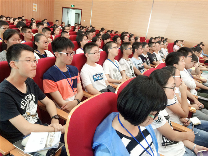 全体高一新生有序进入会场,静候活动开始。首先,高一同学观看了三段由我校优秀毕业生代表录制的视频。视频由现就读于中国科技大学的2015届毕业生时成帅同学,厦门大学的2016届毕业生陈芊芊同学,中科大少年班的2016届毕业生殷正同学精心录制。视频中,三位学长学姐就竞赛,自主招生与高考和高中生活作息等方面分享了自己的经验。三位学长一致认为,竞赛需要建立在自己学有余力的基础上进行,只有这样,竞赛才会成为成功迈入大学的推动力。