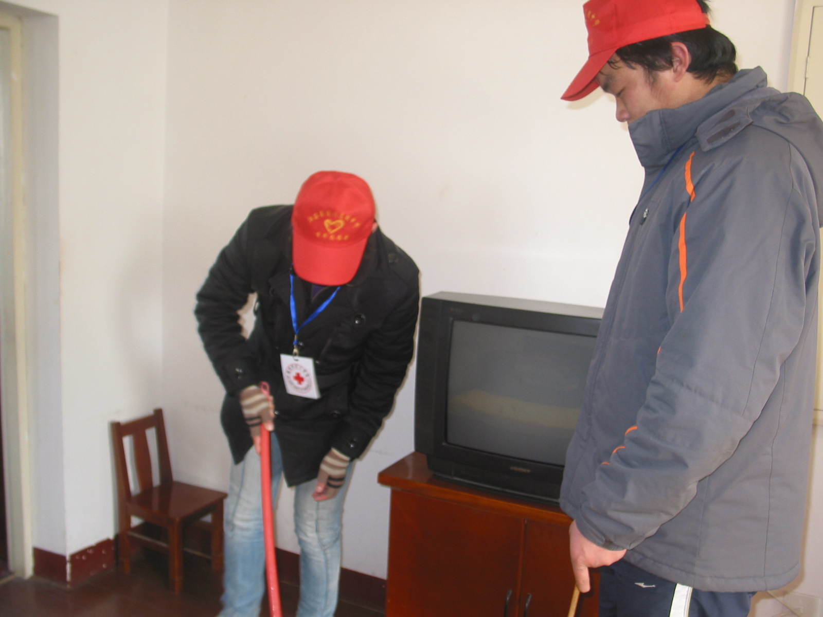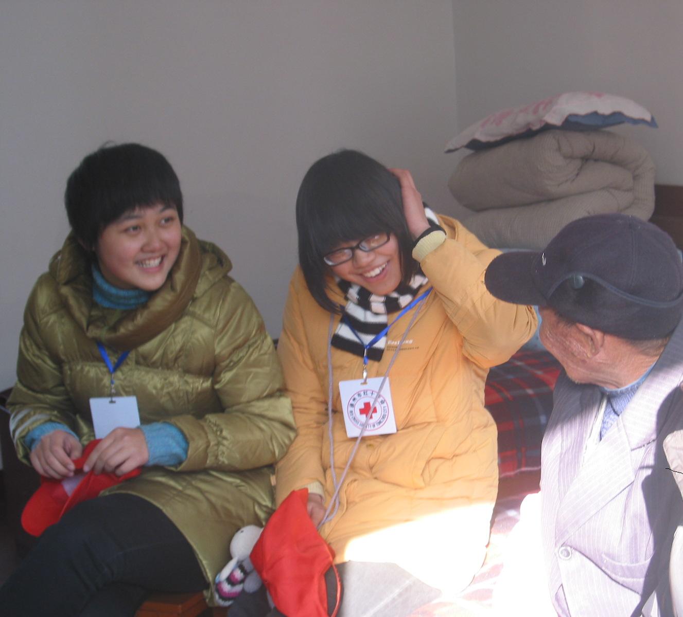 这批“客人”是冒着严寒搭乘203路公交车,从通州城区特意赶到金沙镇农村福利中心来看望和慰问孤寡老人和寄养在那儿的老人的。当这些红十字会员进入大院后,他们立刻三两个一组进入了老人们居住的房间。在后楼老人们居住的房间里,有的同老人聊起了家常;有的拿起扫帚为老人清扫垃圾;有的为老人套被套;还有的用相机拍下师生与老人亲热的镜头。师生们对老人的这种关爱之情令院长和护工们啧啧称赞。
