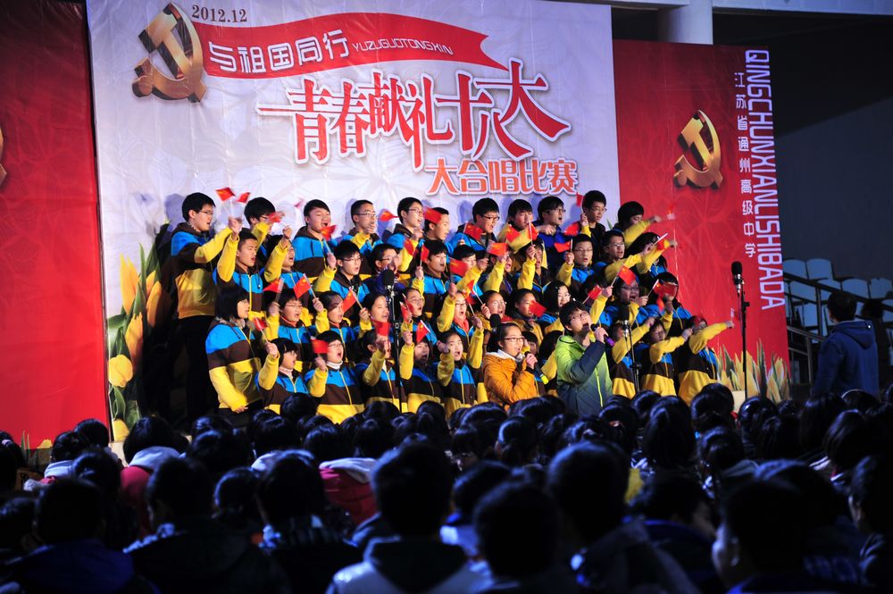 为庆祝党的十八大胜利召开和纪念一二九学生运动七十七周年,12月21日晚,通州高级中学举办了主题合唱比赛,表达同学们对祖国未来的憧憬与期望。