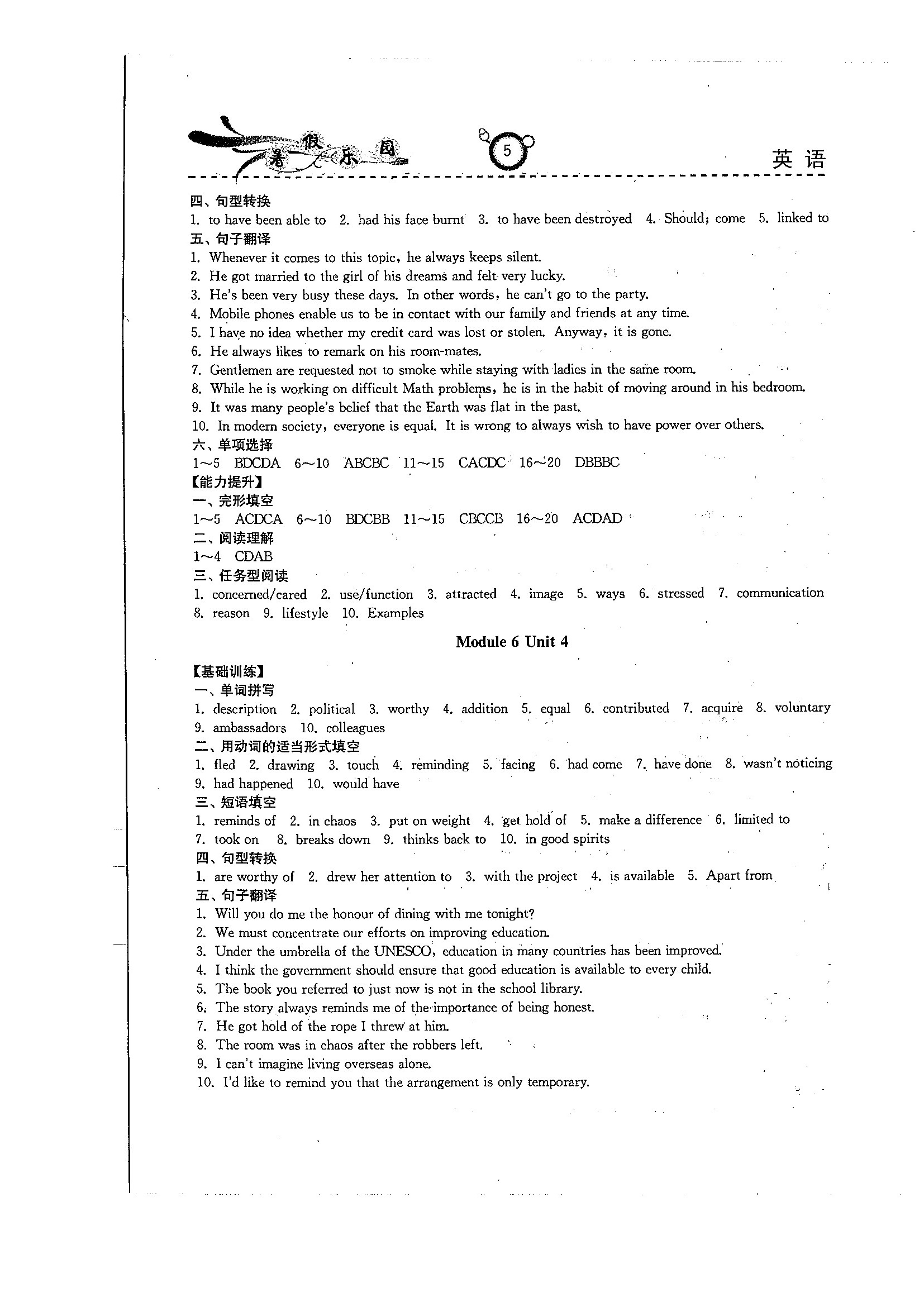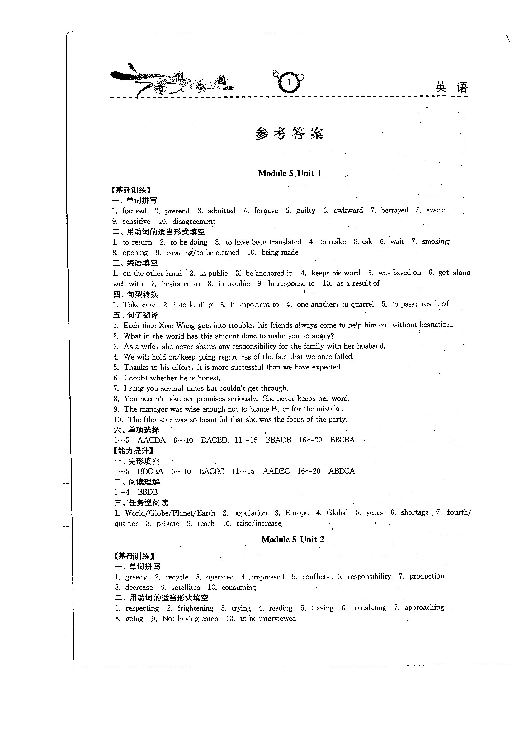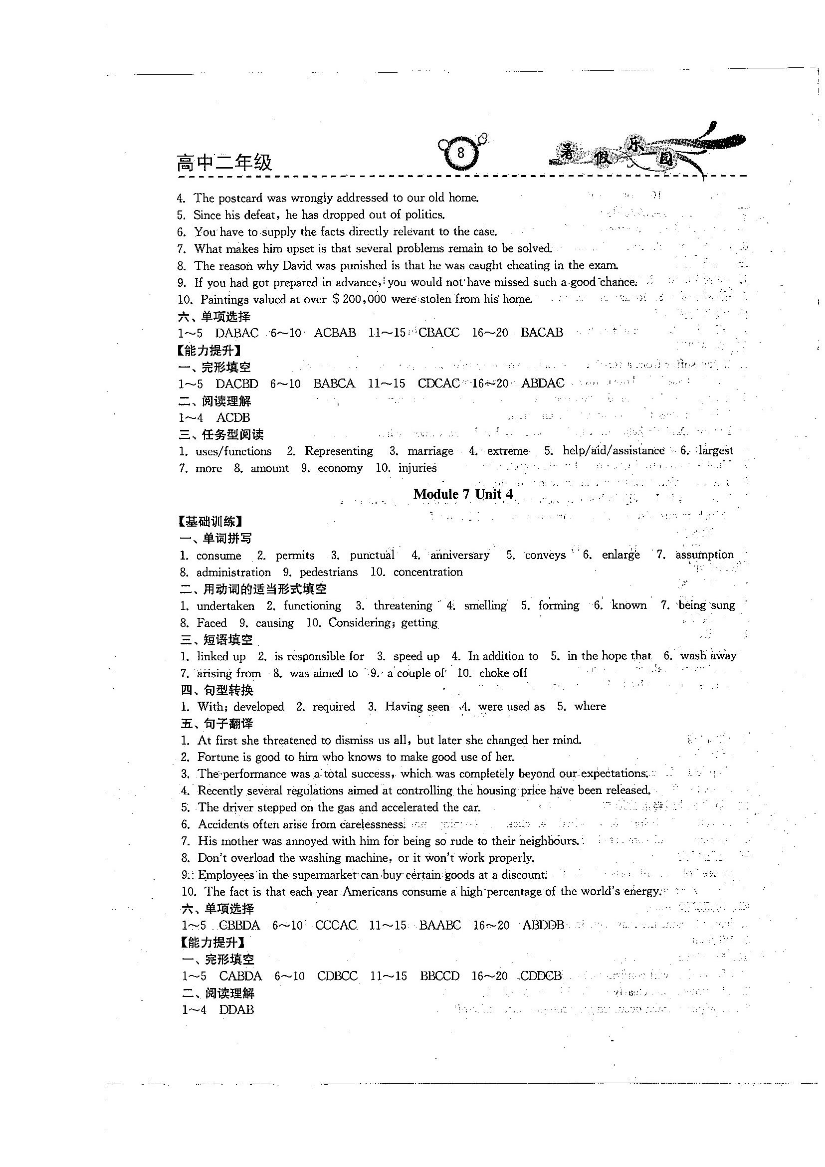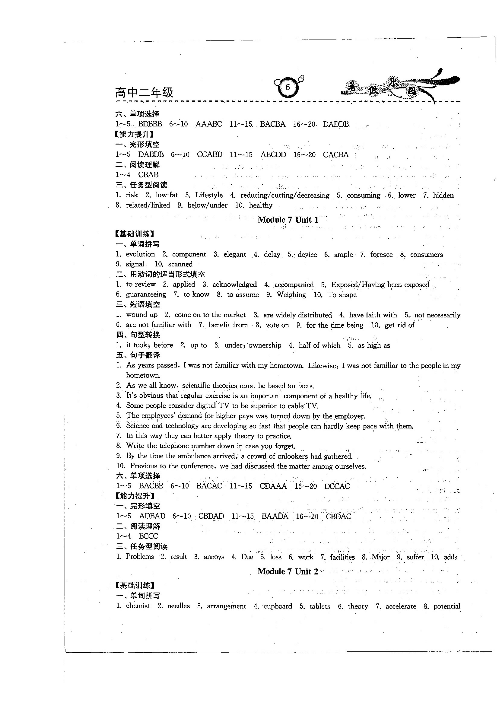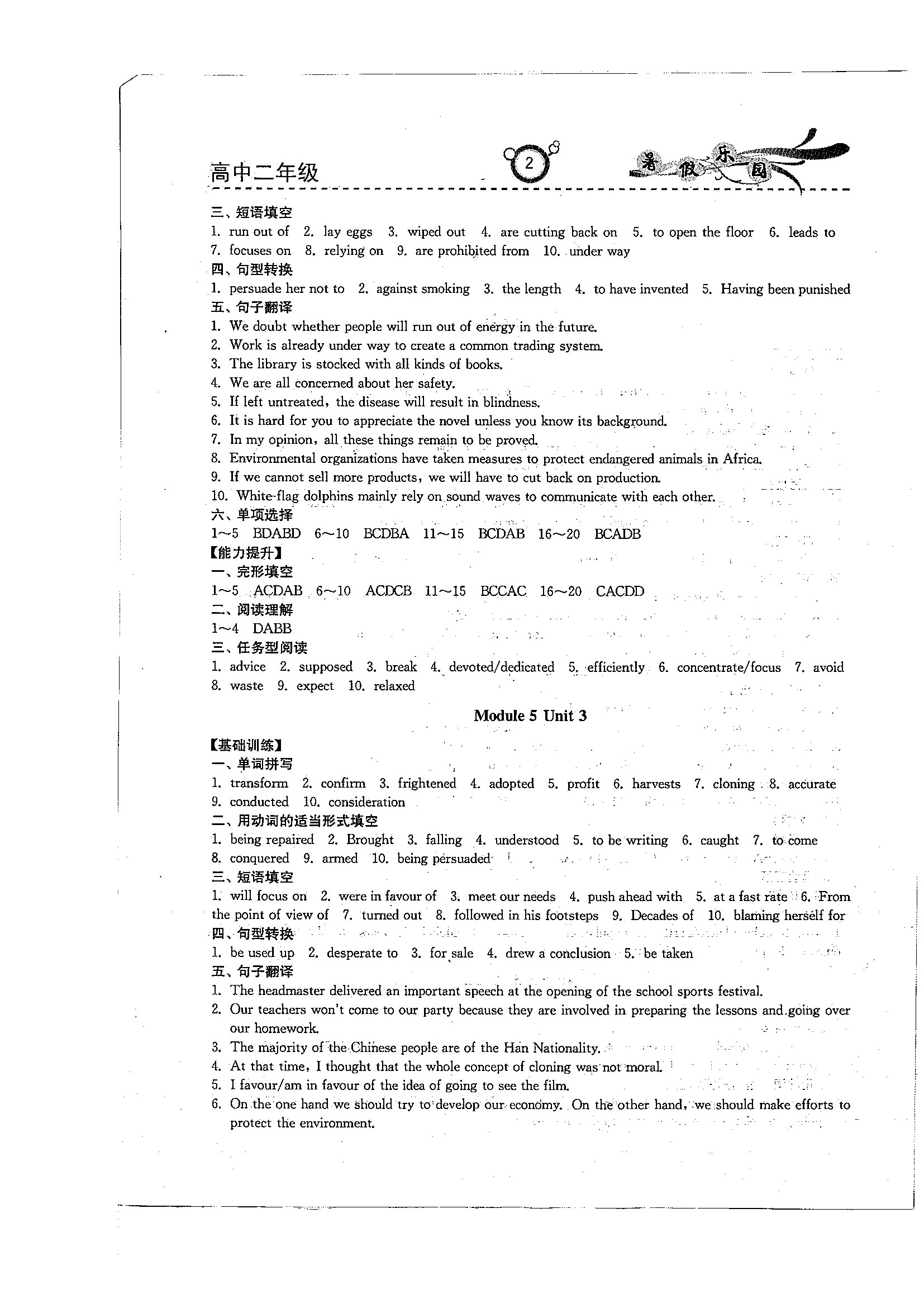 高二英语暑期作业参考答案(暑假乐园)