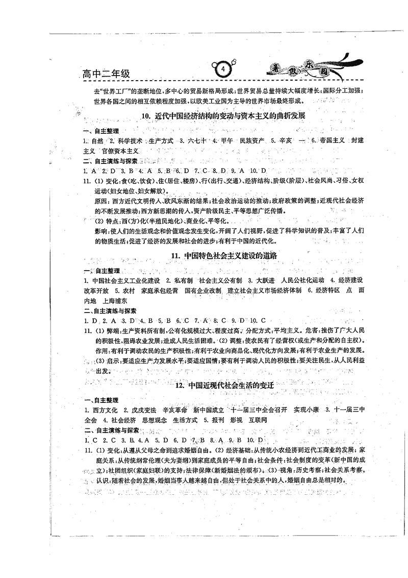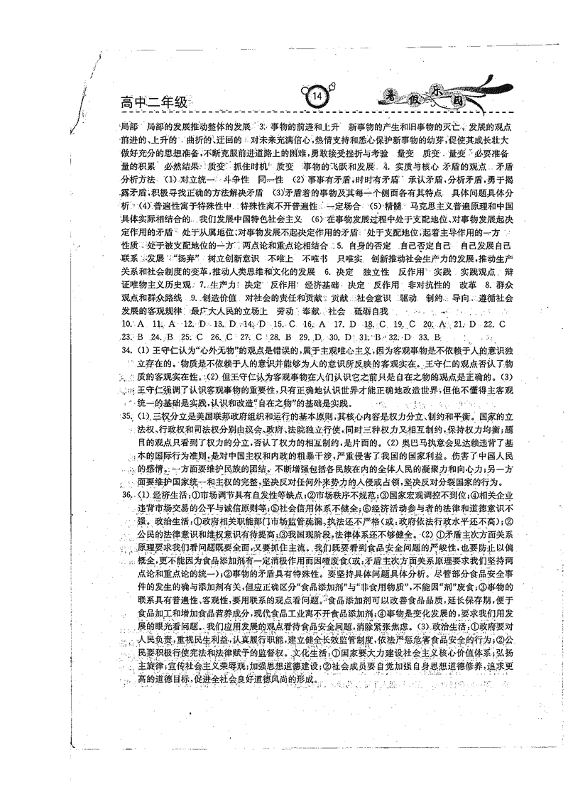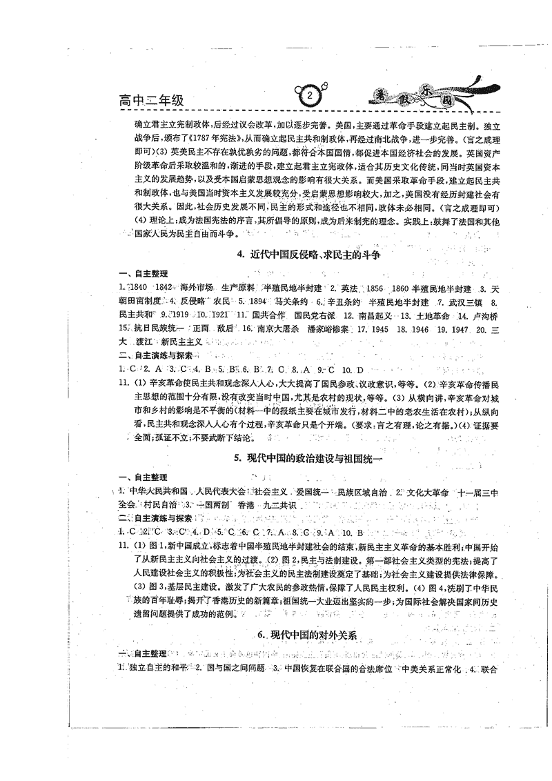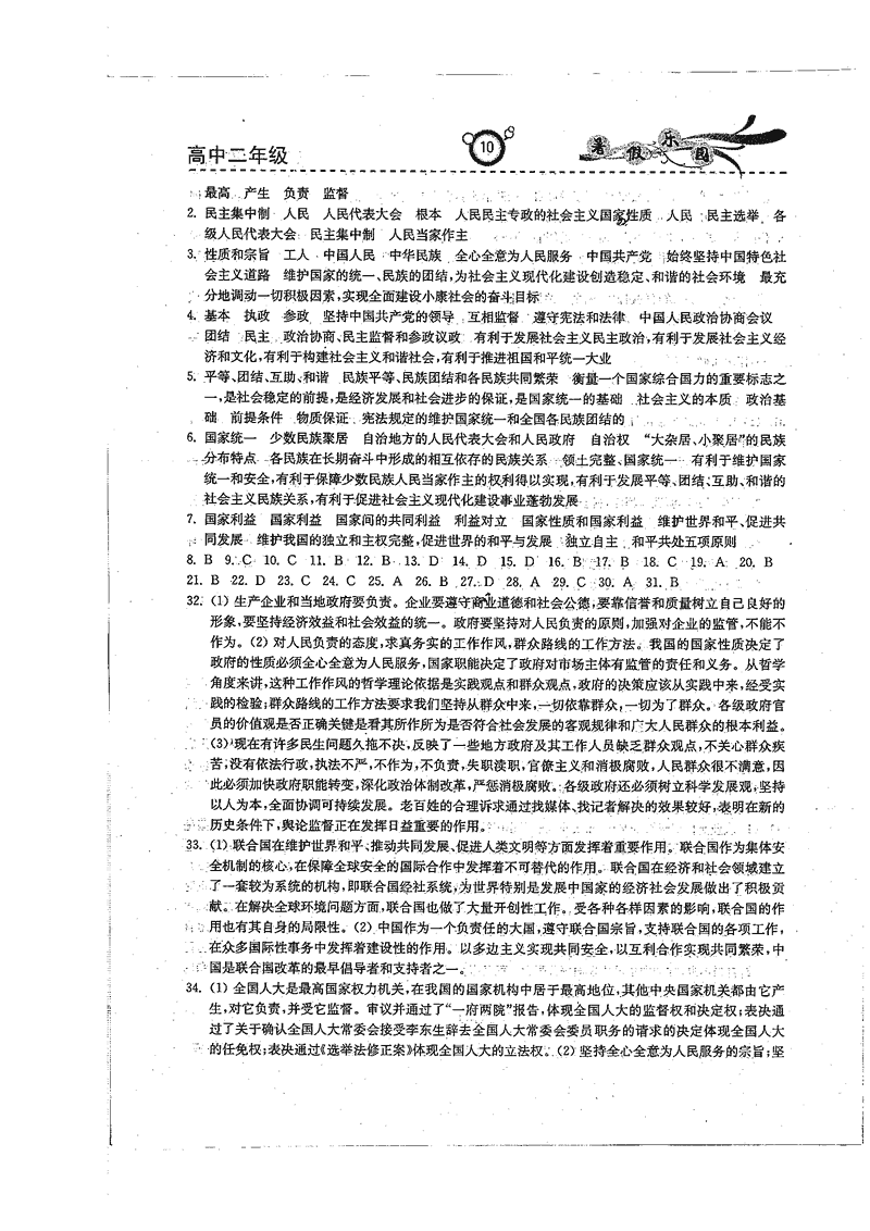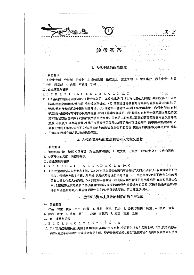 高二政治历史暑期作业参考答案(暑假乐园)
