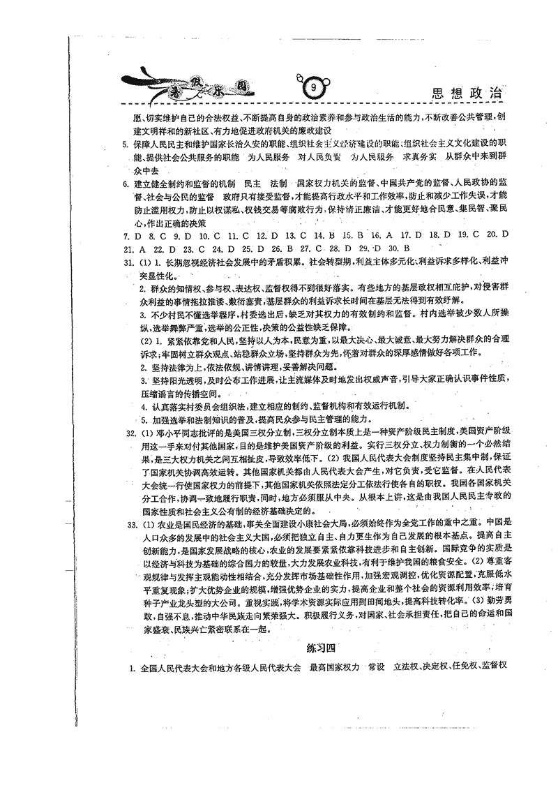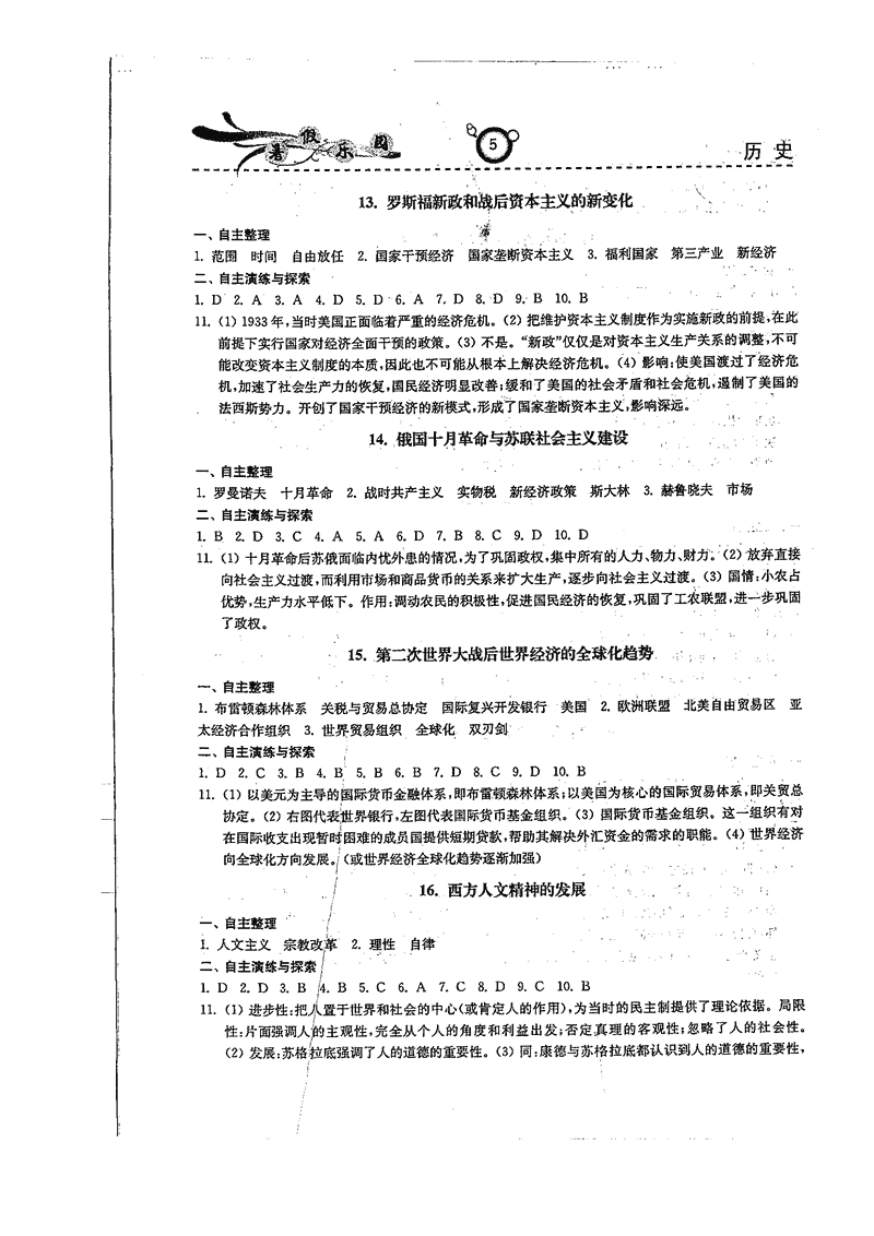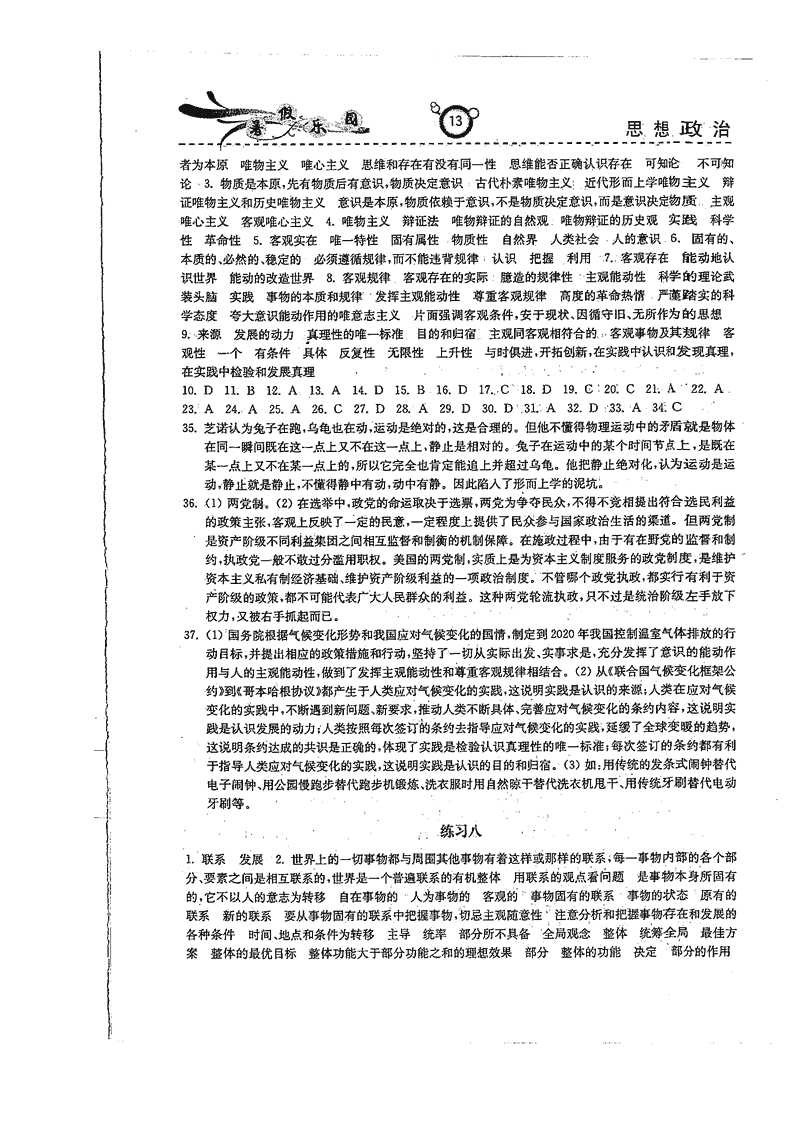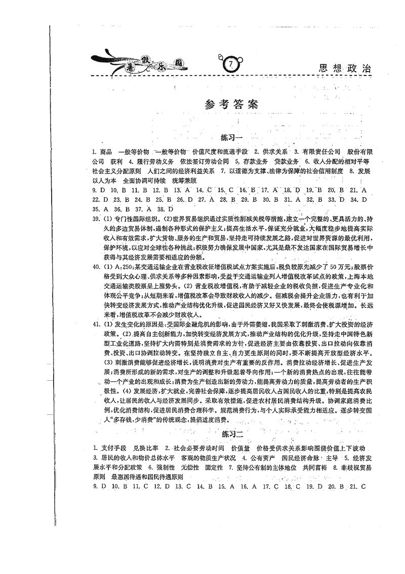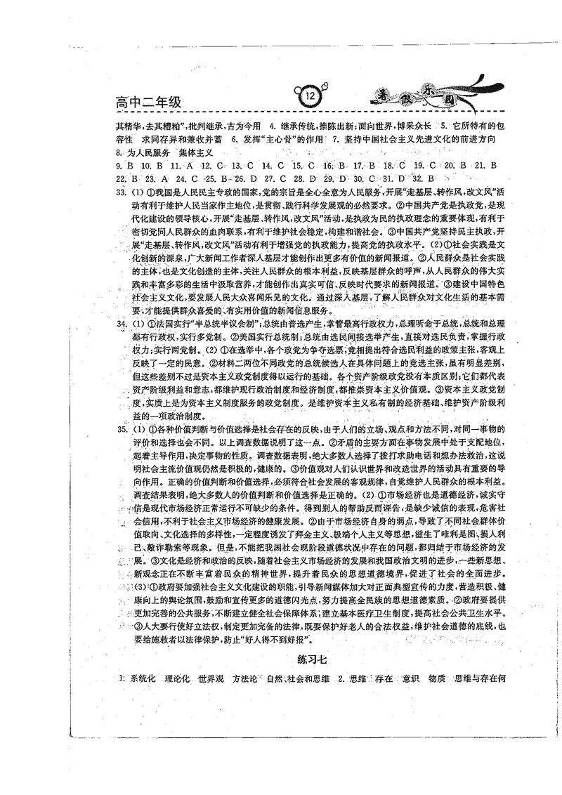 高二政治历史暑期作业参考答案(暑假乐园)