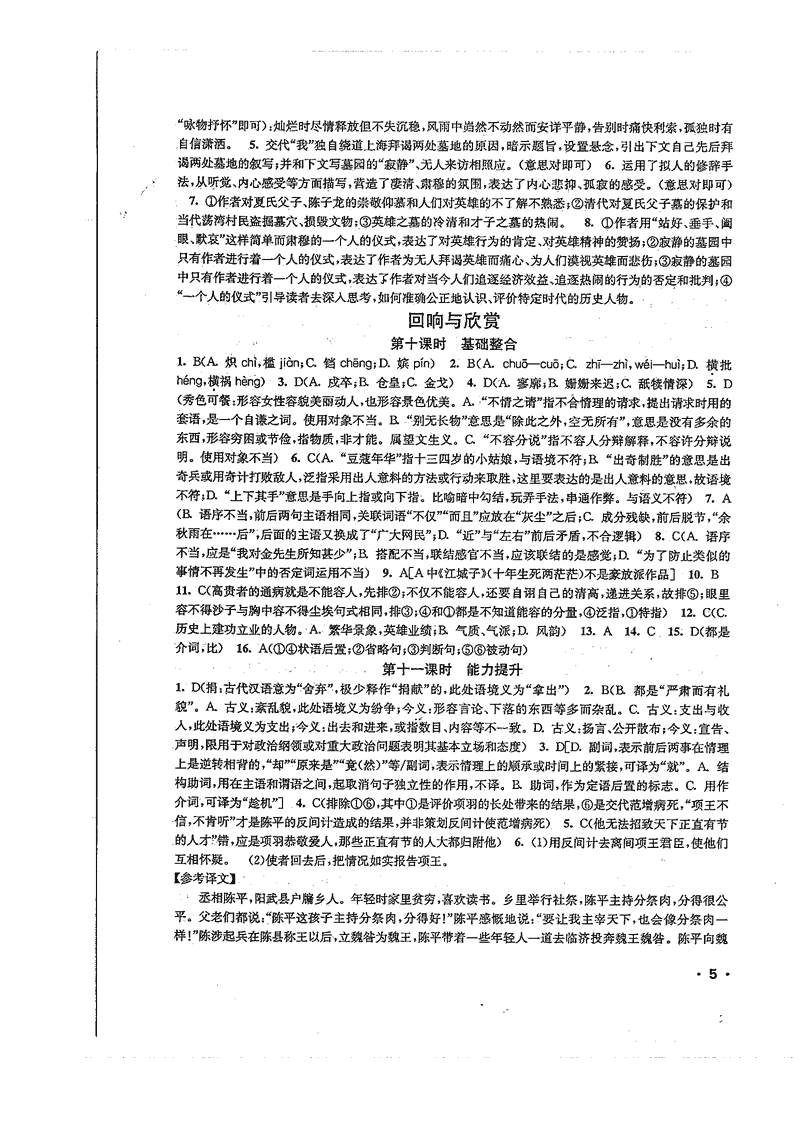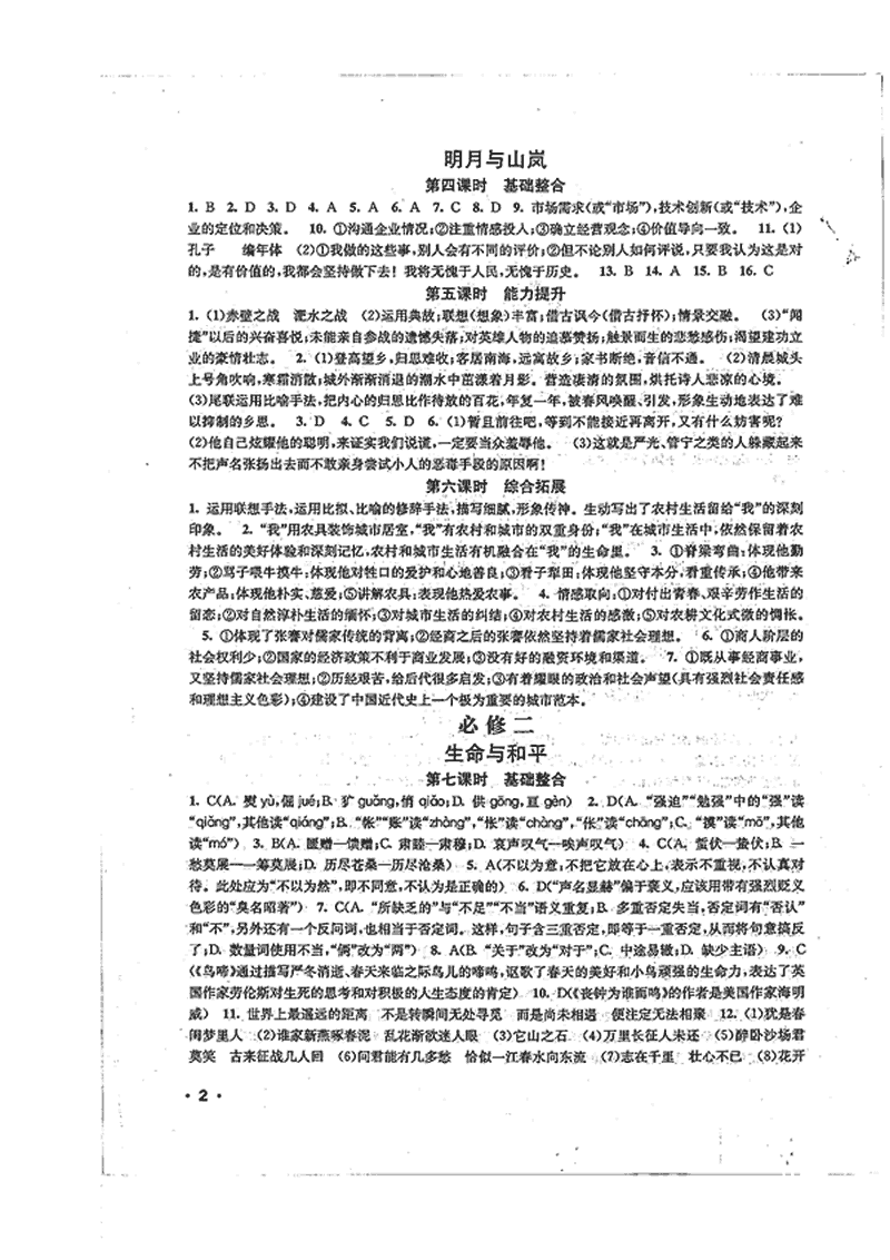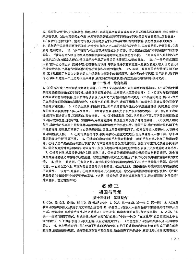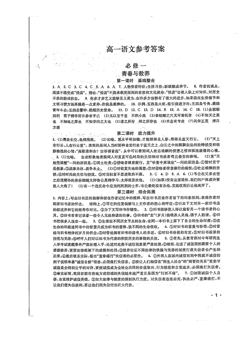 高一语文暑期作业参考答案