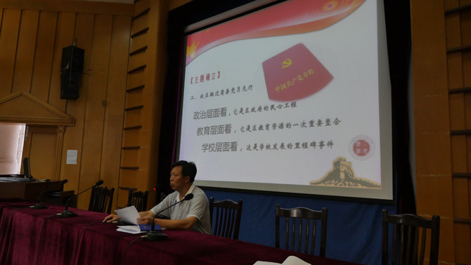 7月10日下午,根据区委组织部、宣传部《关于组织开展“服务群众展形象 先锋引领树标杆”主题党课活动的通知》要求,为庆祝建党94周年,以实际行动践行“三严三实”,同时为配合学校新校区搬迁工作,学校党委集中开展了党课教育活动,主题为“让‘先进’在搬迁中凸显”。