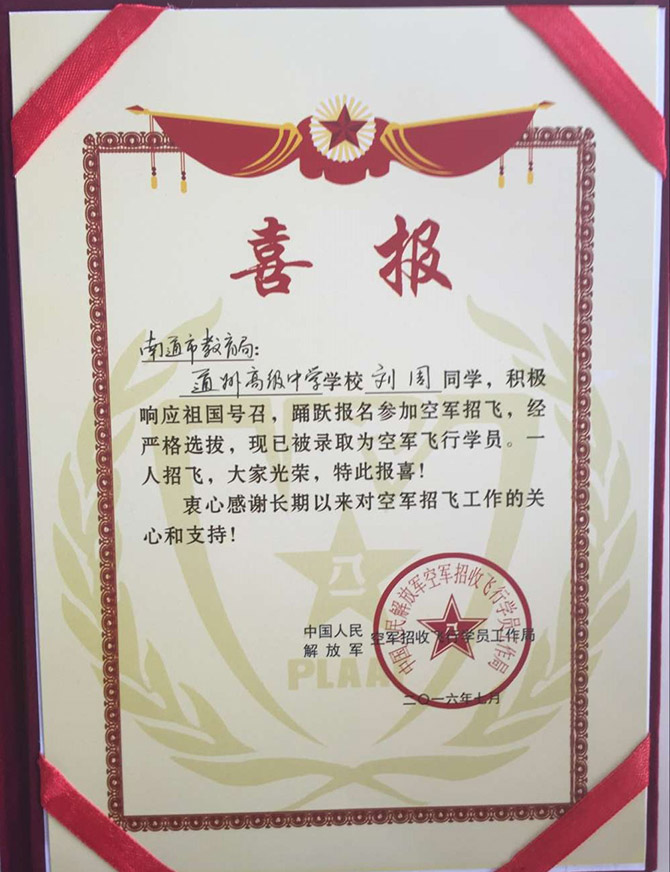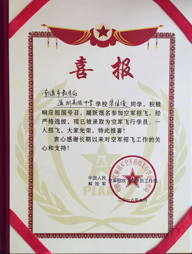 我校向关心支持空军招飞工作的各位首长、辛勤培养朱佳俊、刘周、马诚等三位同学的各位老师表示由衷的感谢,对三位同学及其家长表示热烈的祝贺,希望他们继续发扬通州高中精神,刻苦训练,勇敢擎起捍卫祖国万里长空的使命。学校号召有志于献身国防事业、报考飞行员的同学,做好准备,争取早日加入护卫蓝天的空中雄鹰行列。