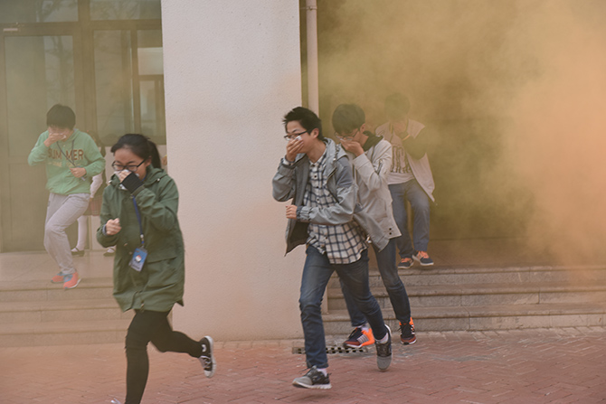 15日下午16时45分,现场总指挥宣布演练开始,地震避险警报声响起。在教室的老师迅速打开教室大门并向学生发出紧急避险指令,全体师生在10秒内进入避险状态,抱头弯腰,躲在课桌下等待警报解除。16时50分,第二阵警报声响起,火灾疏散演练开始。各班班主任以及安全岗负责老师迅速到达指定岗位,各任课老师迅速发出指令指导学生快速疏散,确认教室无人后带领学生用湿毛巾或纸巾捂住口鼻,弯腰穿过烟雾区,沿指定路线快速前进,同时各楼梯口的安全岗负责老师认真排查、积极疏导。短短三分钟内,全体师生都安全有序地到达操场集中,各班学生迅速整队,各班主任开始清点人数并作出汇报。整个演练过程有条不紊,指挥部对活动进行了现场总结。