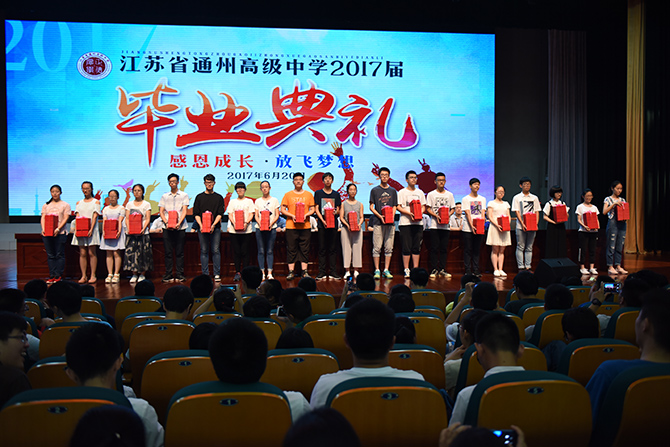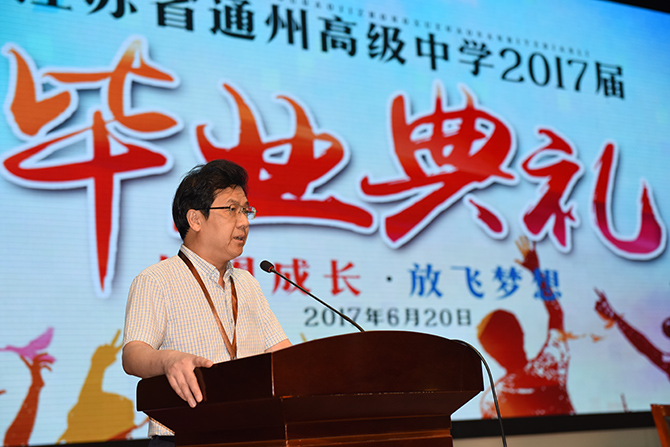 毕业典礼在庄严的国歌声中拉开序幕。季仲平校长首先致辞,他代表学校对2017届师生表示衷心的祝福和感谢,指出毕业典礼的意义“在于站在青春的一个高点,回望历史,憧憬未来,依仗历史给予我们的精神骨骼,雕塑人生”。季校长对即将走出通高校门的学子提出希望:要永远保持优秀;让优秀衍生更多责任;永远保持人格独立,让通高教育“培养完整的人”的意义得以彰显。在讲话最后,季校长动情地说,这里有你们的三年青春,就有你们一辈子的魂牵梦绕,有你们的汗水和足迹,就有你们永远的精神家园!三年一朝别,唯恐语不尽,只待相逢时,与君话佳音!