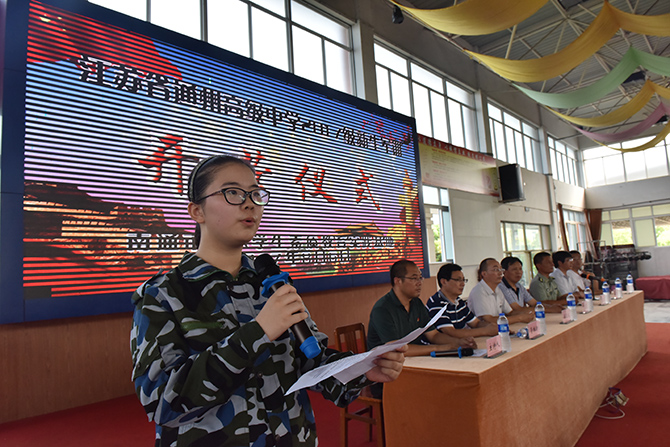 六中队吴争同学代表发言,她说虽然走出空调房不易,但担大任必须有强健的体魄,军训使肉体痛苦的同时,会带来坚强的意志。她代表全体同学承诺:一切行动听指挥,努力完成规定任务,虚心向教官学习,努力学习国防知识,做好内务等工作。
