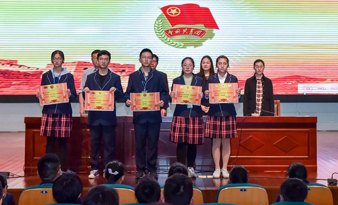 大会在庄严的国歌声中拉开帷幕。秦志强副校长首先致辞,他对获奖同学表达了热烈祝贺,对他们在同学中发挥模范带头作用提出殷切希望。政教处副主任王建军老师介绍了先进集体和先进个人的评选过程。在优秀团支部的评选中,校团委对各团支部工作进行了量化打分,最终在三个年级共选出17个优秀团支部。政教处主任、团委书记巫灿烨老师宣读了“五四”表彰和“五八”红十字表彰决定,号召同学们弘扬“五四”精神,培养青少年应有的良好品质。在与会领导给优秀团支部、优秀社团、最佳宿舍等先进集体和先进个人颁奖后,学生会纪检部部长张宸浩代表获奖同学发言,他倡议大家发扬“五四”精神,担负起一个高中生应有的责任。