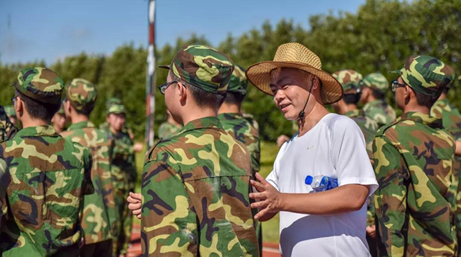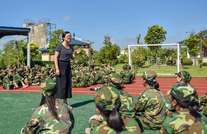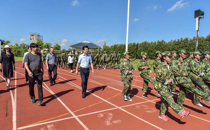 第三天,虽炎热却备受鼓舞,季仲平校长和许斌、秦志强副校长等领导来到基地慰问全体参训师生。长哨一声响,整个训练场地一片肃静,随之,“老师好”的声音高亢响亮,回荡操场,彰显出新通高学子的军人气魄。季校长等领导依次走过中队方阵,关切地询问同学们训练情况和身体状况,用信任的握手表达对高一班主任工作的肯定。军训基地负责人向学校领导详细介绍了此次军训的训练计划及实施情况。季校长强调,要在确保安全的情况下增强学生的纪律意识、礼仪意识,力争做到令行禁止,知行合一。