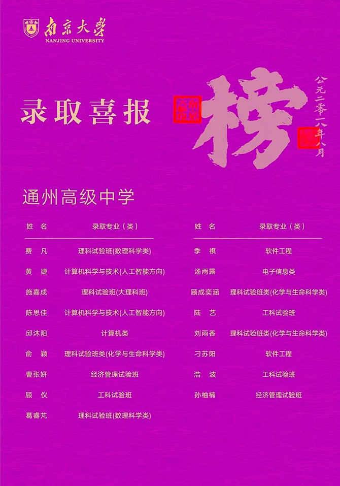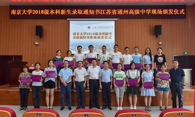 7月23日,南京大学校长助理范从来教授、法学院院长助理刘勇副教授、文学院钱祥升副党委书记等领导一行,到我校为2018年高考录取南大的17名同学颁发录取通知书。颁发仪式由张圣兵副校长主持,季仲平校长致欢迎辞,17名录取南大的同学及其家长、高一高二创新班同学共120多人参加了仪式。