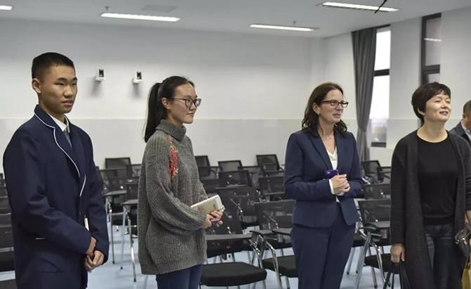 5日下午,季仲平校长热情接待了Tammy Evelyn Vacante女士,首先陪同参观了校园,同时简要介绍了学校历史和发展现状。当得知学校历史将近百年时,Tammy Evelyn Vacante女士高兴地说:伦敦中央高中也是一所百年学校,两校有着相似的历史积淀。随后,Tammy Evelyn Vacante女士继续参观了学校省心理健康教育基地、省英语课程基地,对学校一流的办学条件赞不绝口。观看英语话剧《雷雨》后,她对同学们的英语表达能力给予了高度评价,积极肯定了学校给予学生充分的课程选择权和能力发展空间的教育生态,认为这些带给她对中国基础教育更全面的看法。