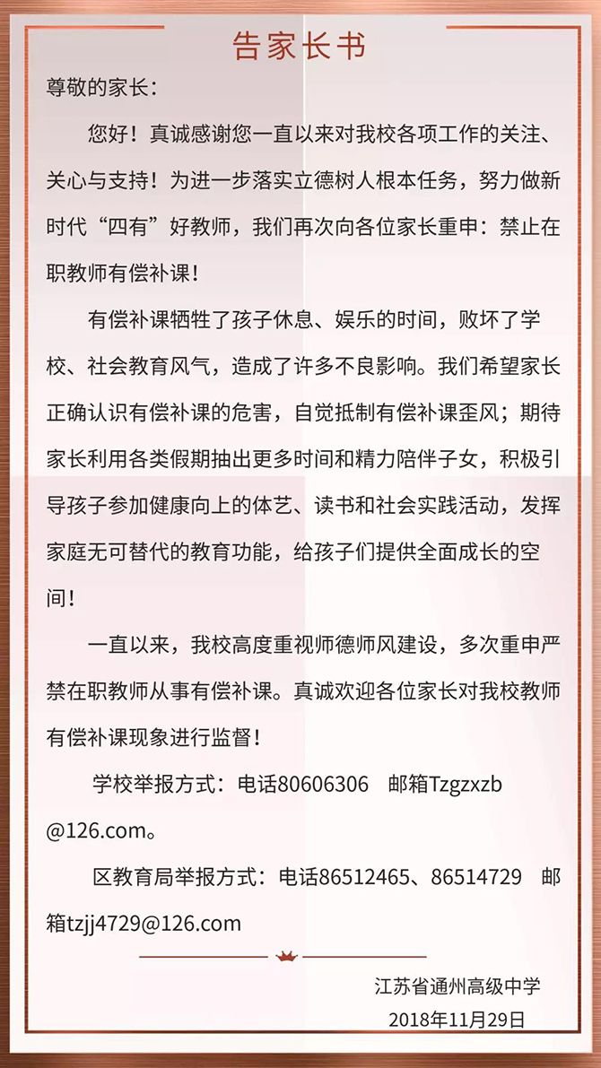 在此基础上,翟书记通报了2018年11月13日中共南通市纪委通报中涉及教师有偿补课的内容,强调全体教师要提高对有偿补课危害的认识,自觉拒绝有偿补课,并语重心长地从“带坏社会风气、影响教师专业发展、损害学生身体健康、增加家长家庭负担”等四个方面谈有偿补课的危害。
