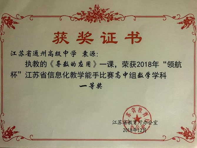 12月4-7日,由省教育厅主办,省教育信息化中心承办的2018年 “领航杯”江苏省信息化教学能手比赛在镇江举性。我校袁源老师在比赛中脱颖而出,荣获高中数学组一等奖第一名。