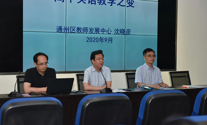 9月2日下午,我校举行第二场新高考研修活动,通州区教师发展中心沈晓彦主任应邀为英语组全体教师开设了专题讲座《新课标新高考背景下高中英语教学之变》,活动由季仲平校长主持。
