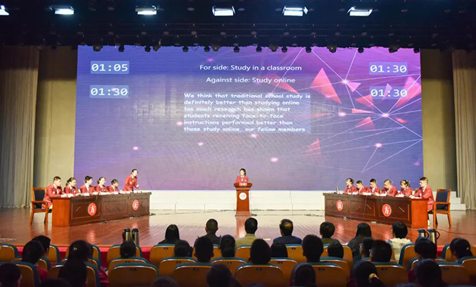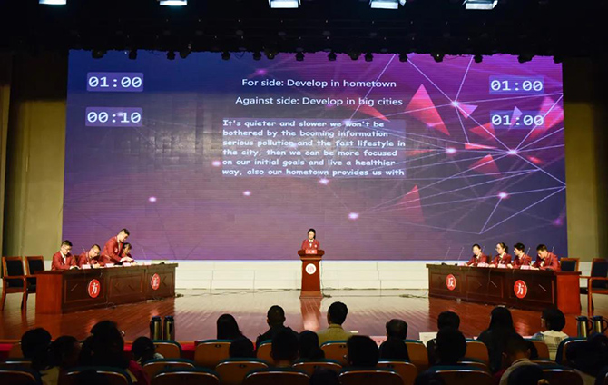 比赛由高二5、6、8和18班组建的两支队伍参加,共分淘汰赛和决赛两个环节,全程英文辩论。淘汰赛围绕“传统教室学习/网络学习对学习更有利”展开辩论,八名选手脱颖而出进入决赛。