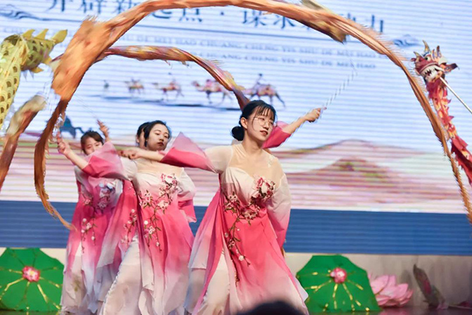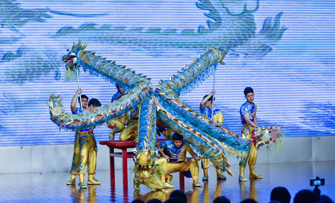龙腾狮跃,这场展演传承了龙的文化与狮的精神。《骆山大龙》一展浩然正气;《龙腾华夏》仙子羽衣轻扬,祥龙逐珠矫健敏捷,表达了爱与和谐的主题;烟雨入江南,山色如墨染,菡萏初绽,荷花龙嬉戏,一场《江南烟雨》柔美温软;《一带一路》用龙狮文化演绎古丝绸之路的辉煌历史;《步步登高》是对通高学子的美好祝愿;刚柔并济的《花木兰》展现了巾帼英姿;《飞天》飞龙在天,纵横四海;《秦王点兵》鼓点昂扬,鼓声雄厚,敲响新时代的红色颂歌……最后一个节目《盛世华章——新时代》将整场演出推向高潮,七十年盛世华章,新时代青春嘹亮,节目用龙狮演绎新中国波澜壮阔的伟大历程,将爱党爱国主题融入其中。