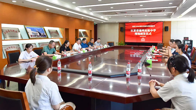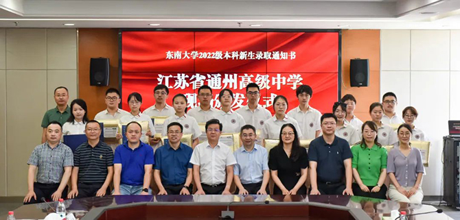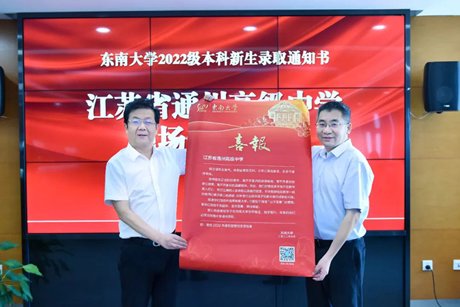 7月29日上午,东南大学副校长金石,招生办主任张力,南通地区招生组张璐、宋美娜、周建新等一行5人亲临我校,为毕业我校的东南大学2022级本科新生颁发录取通知书,并送来祝贺喜报。校党委书记、校长季仲平,党委委员、副校长张圣兵,党委委员、副校长巫灿烨,副校长何忠峰,党委委员、教务主任张春明,校长办公室主任张炜等参加了颁发仪式,仪式由张圣兵副校长主持。