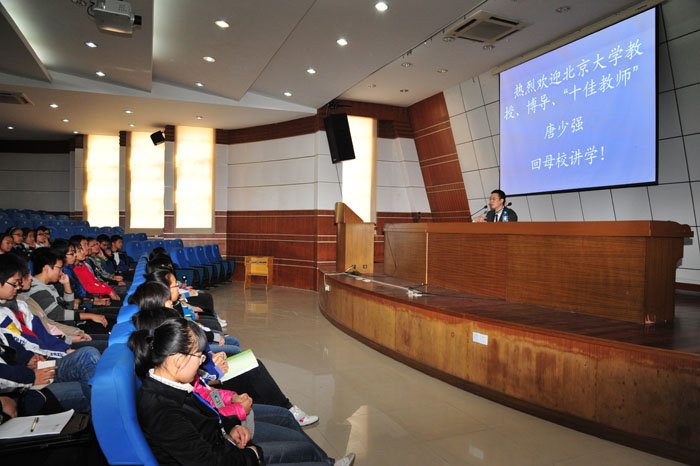 2011年11月21日上午9时许,北京大学唐少强教授回到母校通州高中。身为博士生导师和工学院副院长,计算力学与应用数学方面的专家,教育工作、科研工作、行政工作集一身,忙碌是可想而知的。这次是在参加完浙江嘉兴的一个国家级核技术方面的科研会议后挤出了一点时间匆忙而来的,前后逗留了充其量两个小时。两个小时里,他在母校校长和当年班主任老师陪同下徜徉于校园,寻找当年的一丝半点旧影,感叹旧貌变新颜;他在母校的讲台上与一百多名学弟学妹侃侃而谈,谈“县中”上学的时光,谈科大、北大、加州理工、哥伦比亚大学,谈理想、兴趣、责任担当……一课时的交谈与互动,他又把学弟学妹们变成了自己的“粉丝”。他们感言:“唐教授以大家儒雅的风范,中西合璧的谈吐,睿智深远的眼光,引领我们度过了一场45分钟的求学曼妙旅程。”